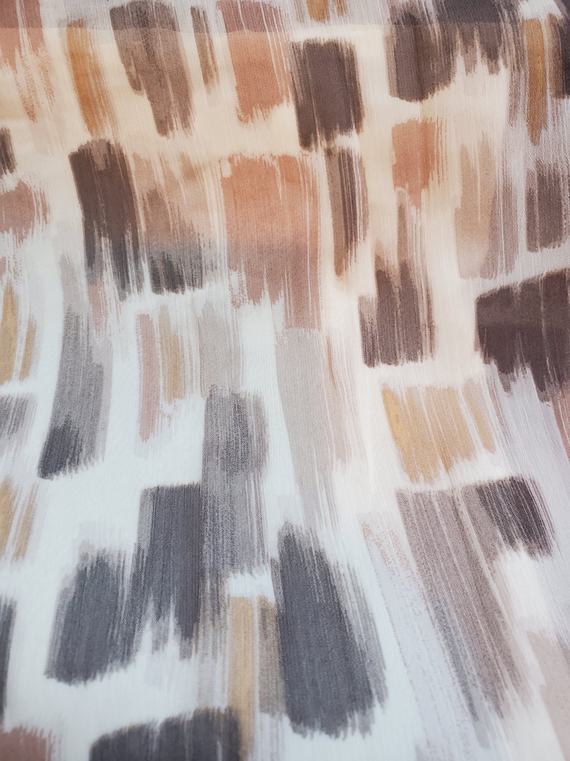 This blouse features muted colors of taupe, gray, rose in a paintbrush like pattern on a ivory background. This top is lined, has button front and smocking at the neckline.