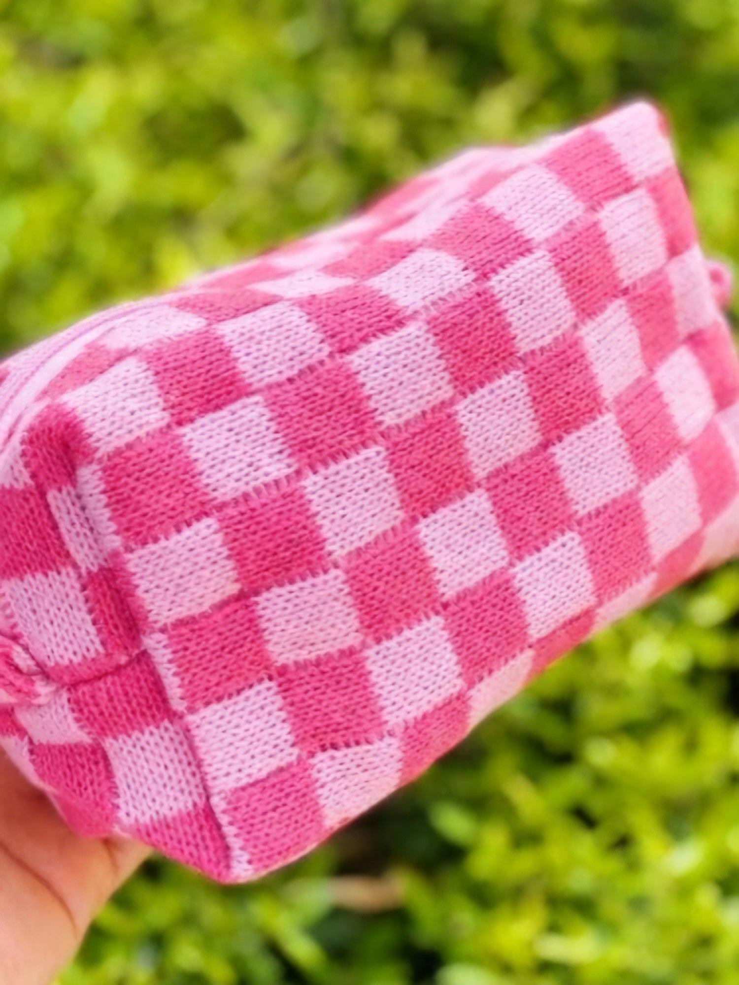 Each bag is in a checkered pattern knitted material with a light vinyl lining inside.