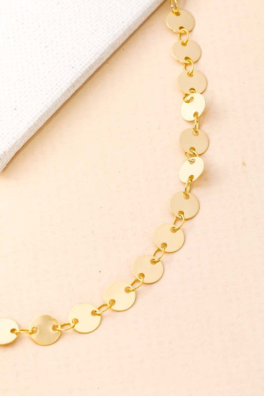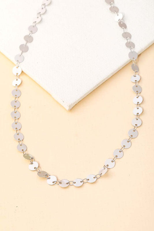A chic casual must have necklace that is in a metal coin chain link design. Gorgeous alone or layer for a more unique look.