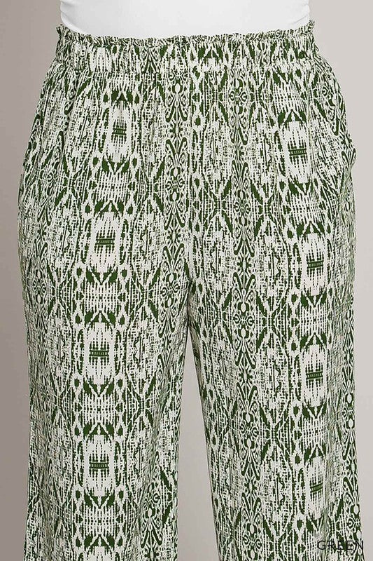 These green ethnic print pants feature smocking detail at the waist, pockets, lightweight material and wide legs.