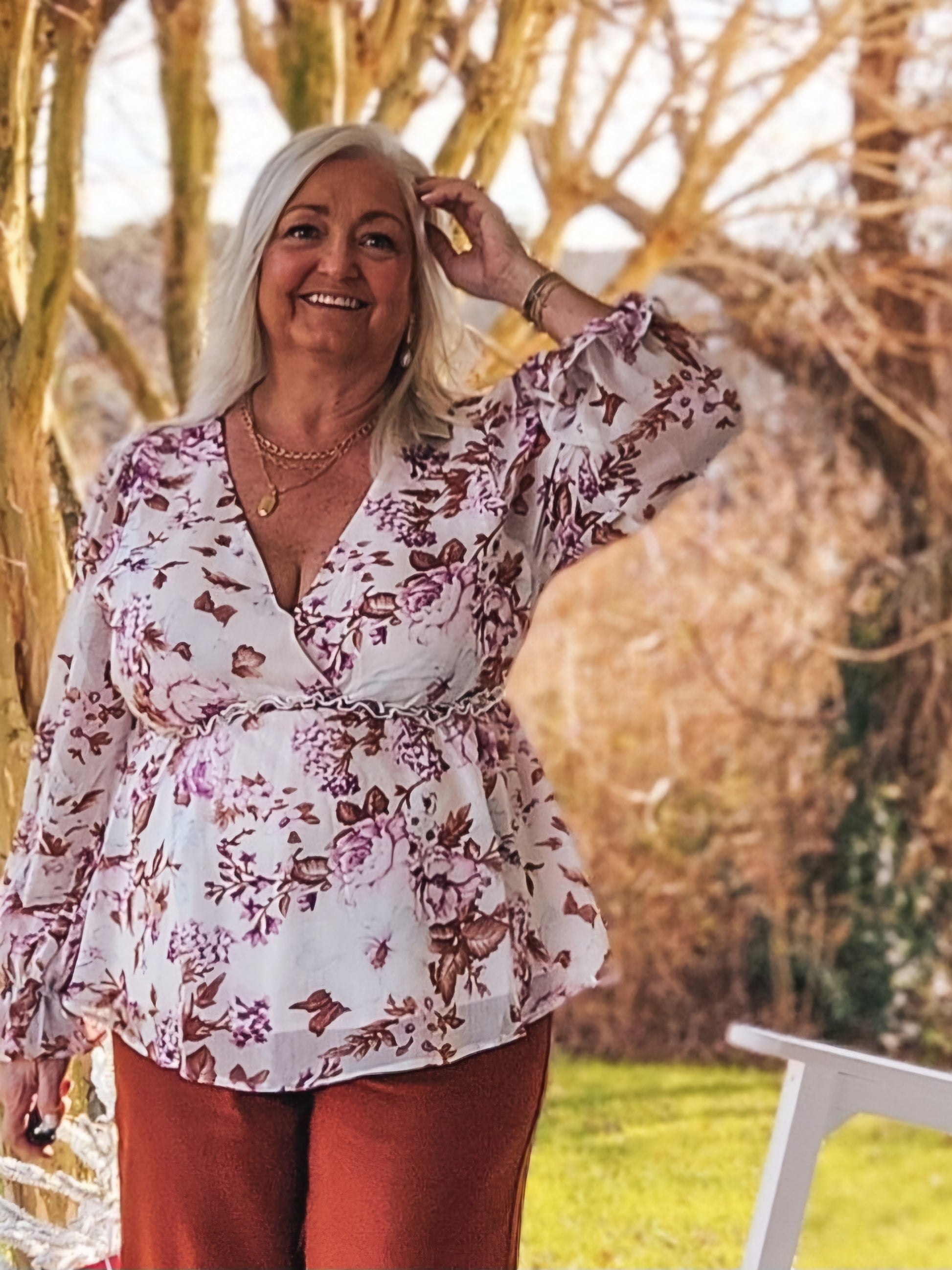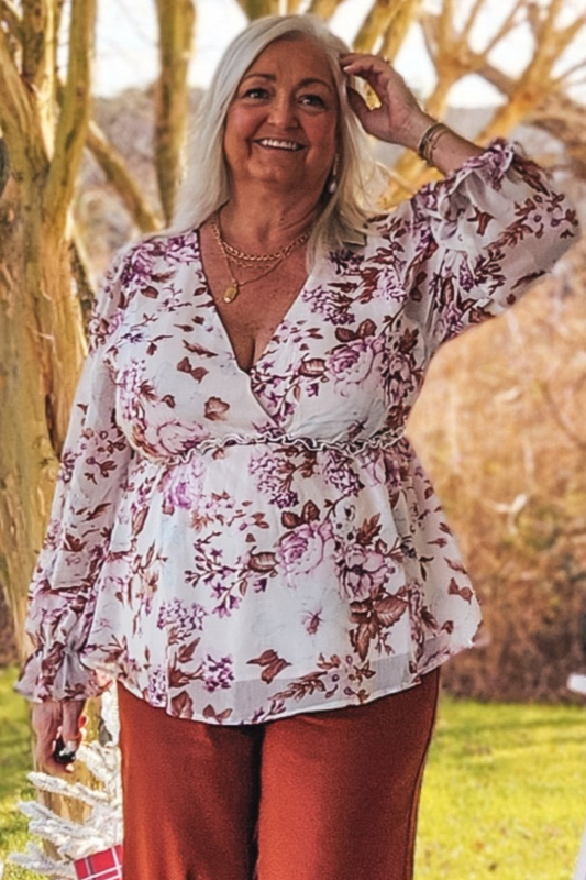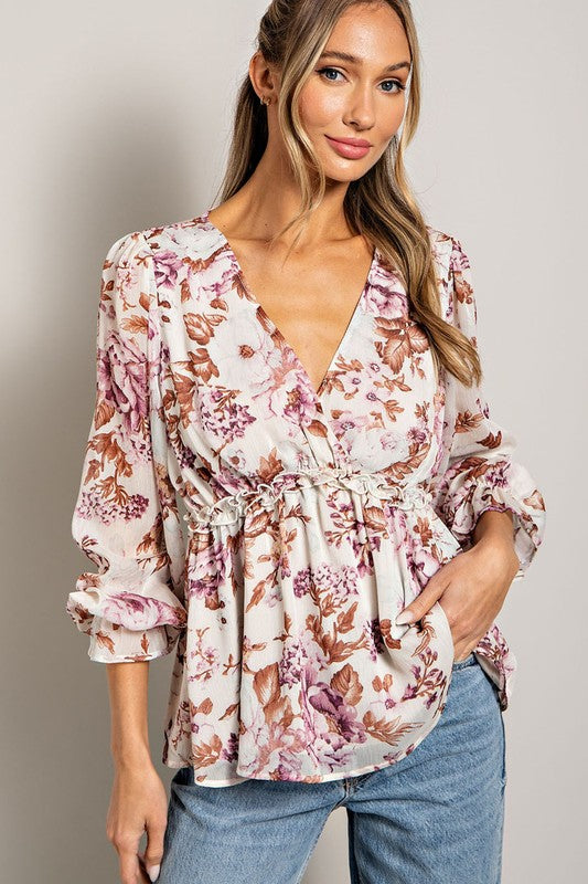 This floral top with wine and copper colored flowers on an ivory background features a crossover v-neckline with snap, ruffle seams at waist with added elastic, keyhole button closure and elastic cinched cuffs for a belle sleeve effect.
