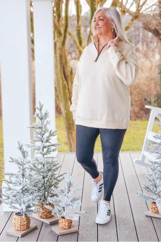 This half zip top features soft fleece lining, stand up, black accent half zip zipper, cuffed sleeves, cuffed hemline.
