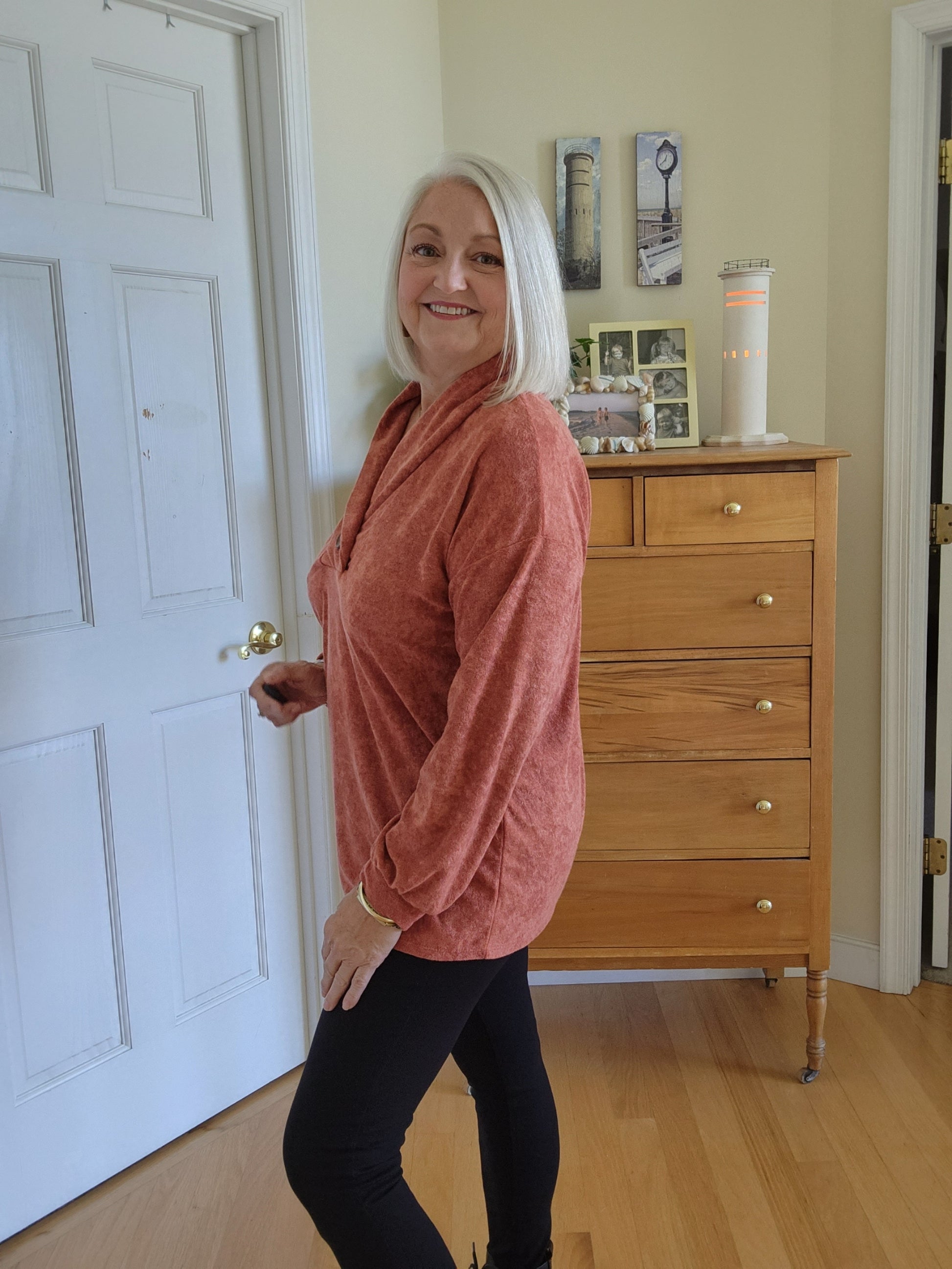 This top features a rich rust/terracotta color in a "velvet-like" medium weight crushed material, shawl-like collar, non-functioning button, cuffed sleeves and straight hemline.