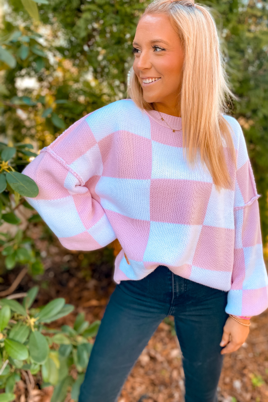 Introducing our Pink Checkered Bishop Sleeve Sweater designed for the woman who appreciates style that transcends seasons. Easily transition from the crisp days of winter to the blooming warmth of spring. The lightweight yet cozy fabric ensures comfort, while iconic checkered pattern offers a timeless fashion statement. The bishop sleeves also offer a breezy and comfortable fit.