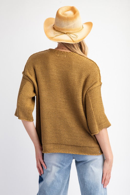 This olive-colored knit sweater features a rounded neckline, half sleeves, inside out stitching details, side slit, crochet detail at the bottom and loose fit.