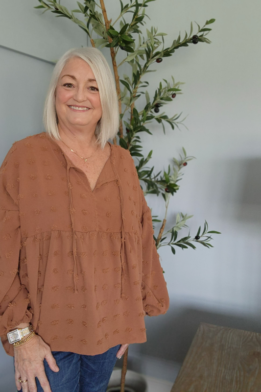 - Fit: Misses; the babydoll cut is loose-fitting, flowy type of top, you can size down if you prefer a more fitted look; Marsha is in a medium