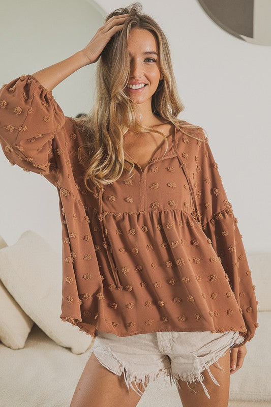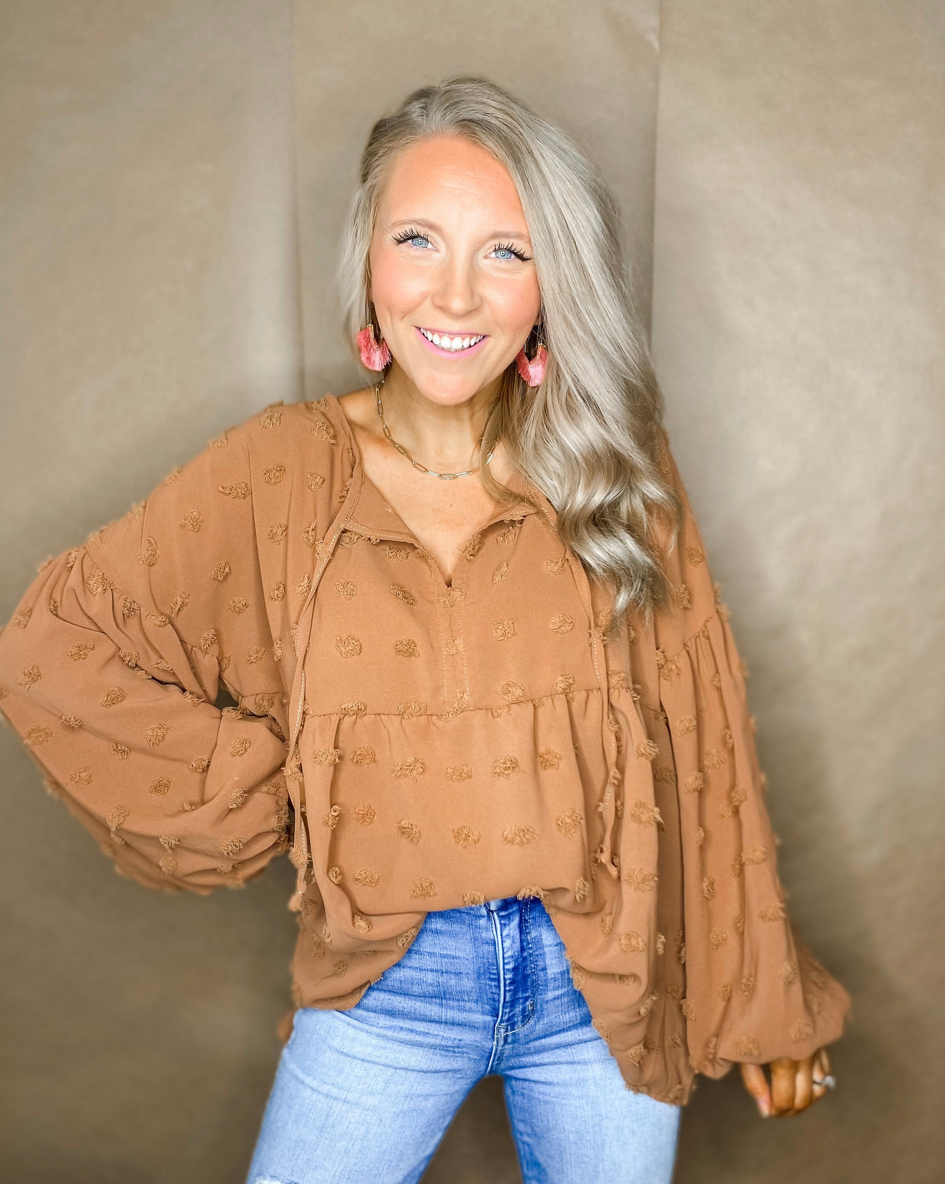In a rich camel color this top features a baby doll cut, v-neck with ties, elastic cuffs and a subtle high-low hemline.