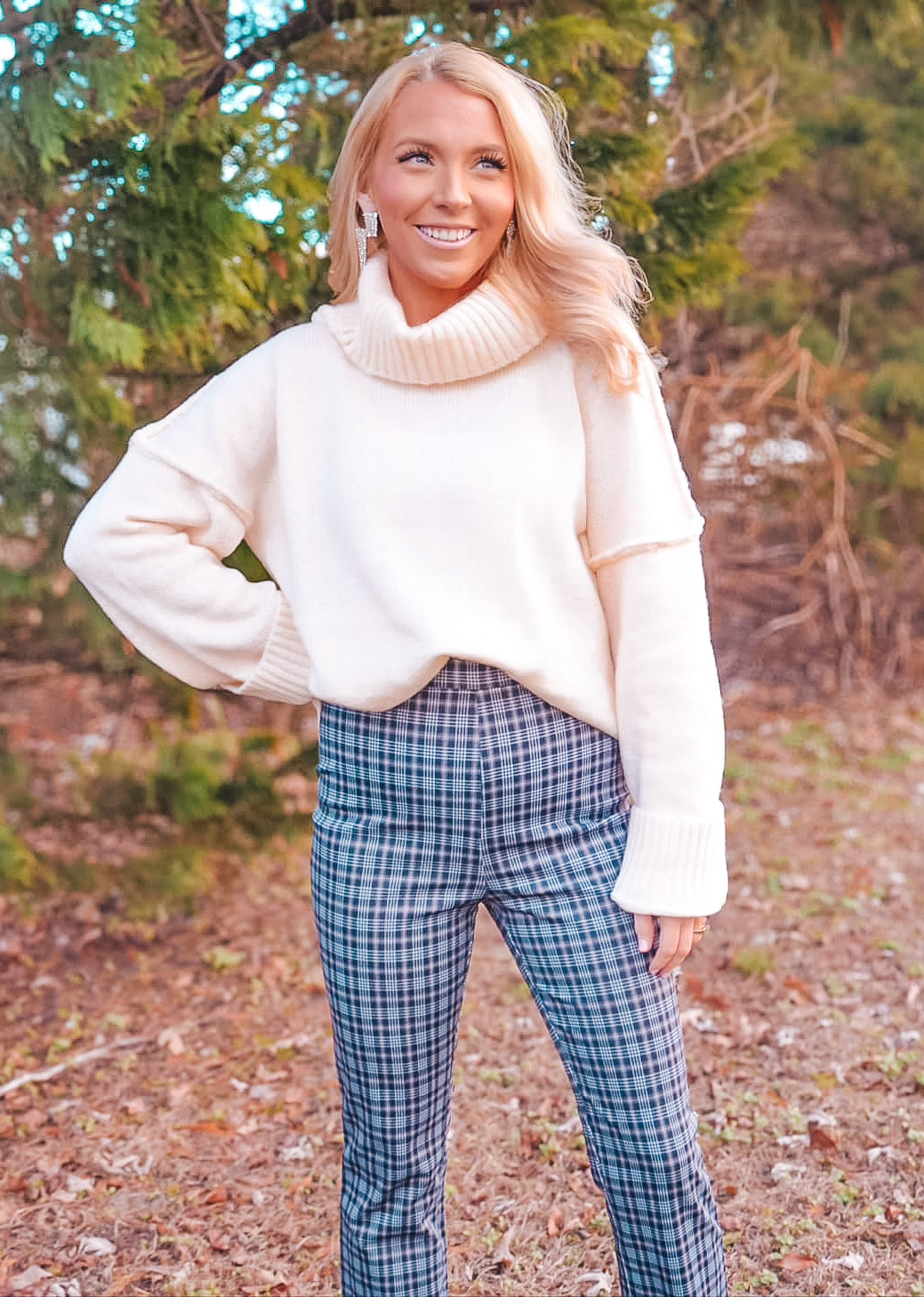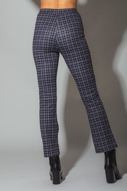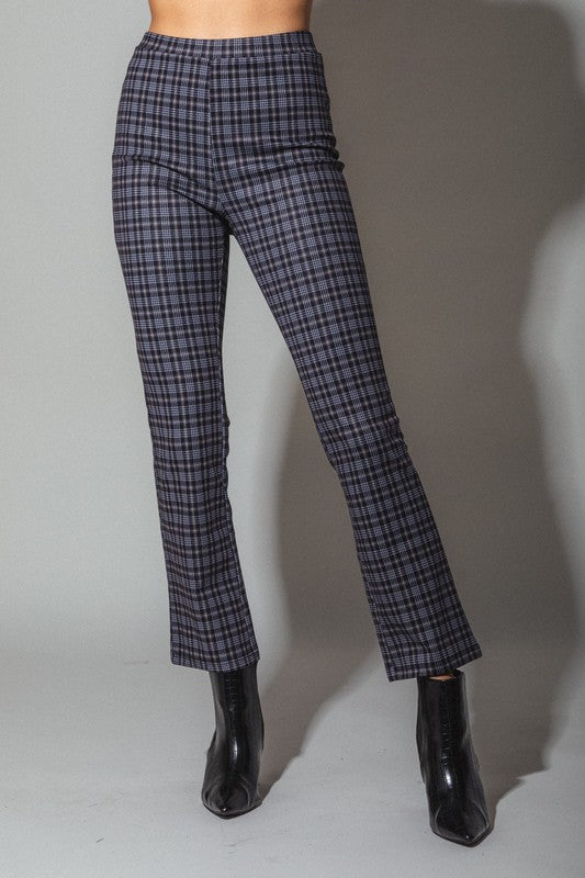 These black plaid leggings feature a soft material, 1" wide waistband, hemmed hemline and approx. 9" wide leg.