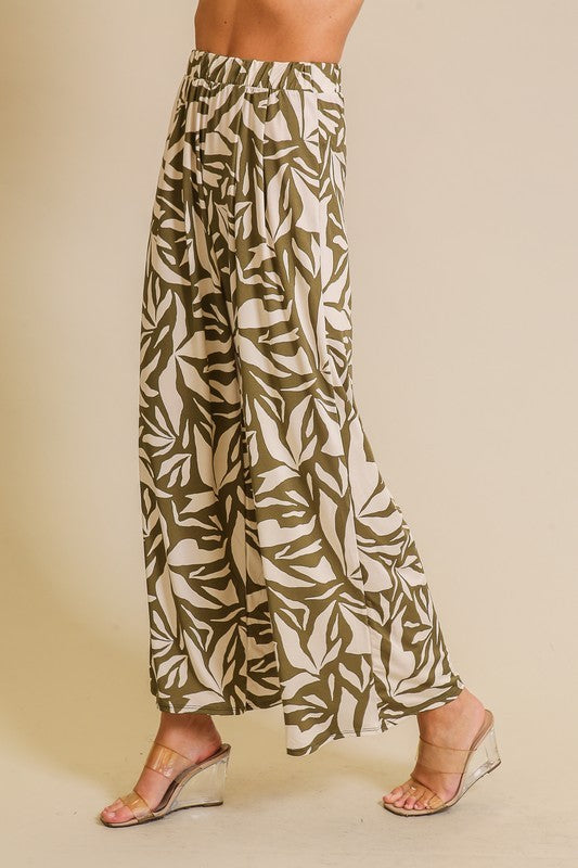 Breezy, bold, and effortlessly chic — our Saltair Breeze Pants are your go-to for warm days and relaxed nights. Featuring an earthy olive and ivory tropical leaf print and an easy elastic waistband, these flowy pants pair perfectly with a fitted tank or oversized button-down. Ideal for beach strolls, brunch dates, or casual office days, they offer style without sacrificing comfort.