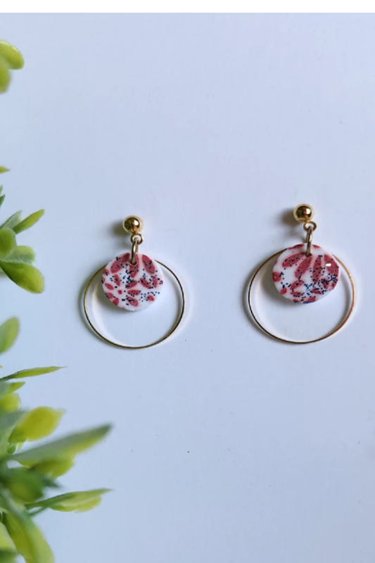 Simply Saige Red Circle earring is a handmade and one-of-a-kind piece of jewelry made from polymer clay. It features shades of red and white with iridescent glitter, dangles gracefully on a dainty gold circle. Red is one of F/W '23 colors. Looking to add a splash of it to your wardrobe without wearing red clothing? Look no further! This dangle is your perfect way to do so!