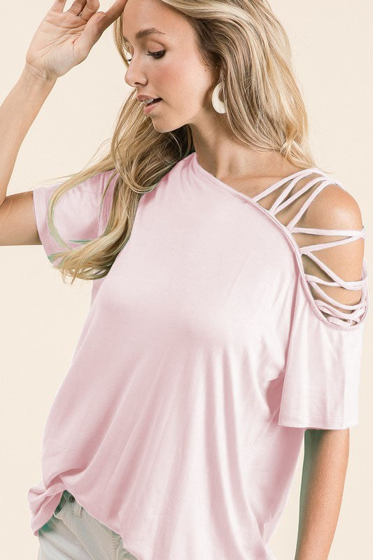 Cut from jersey knit this cold shoulder top features solid strap detail on one shoulder.