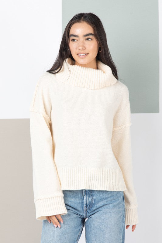 This timeless mid-weight sweater in a cream color features raw seam detail, long sleeves, drop shoulder, ribbed hem and side slits.